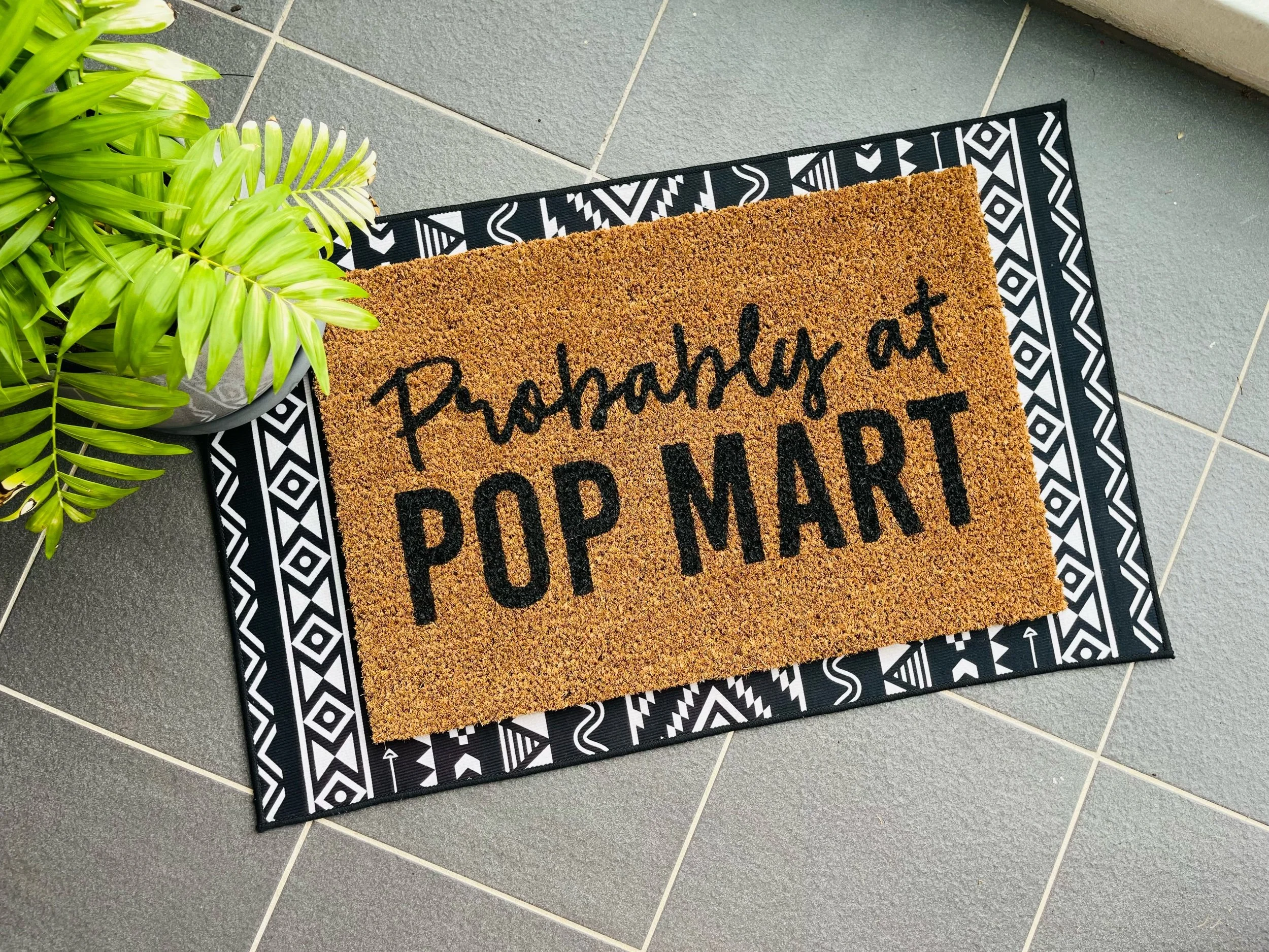 Hand-painted in my Sydney studio, in Australia, this 'Probably at Pop Mart' coir mat is a cheeky nod to your love for all things cute, collectable, and a little bit obsessive (in the best way).